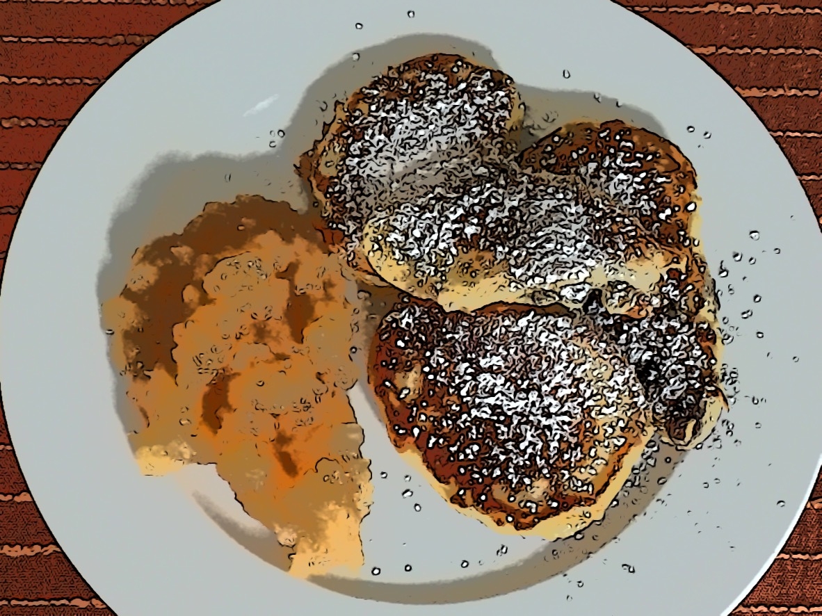 Kartuffelpannkoeken up westfaölschke Aort met Appelkompott Wat wi daobi doot: 1 kg Appel, süerlick, schiält un entkernt, in grouwe Stückskes schniedden 1 EL Buodder 3 EL Sucker 1 Vanillinsucker 4 EL Zitronensaft 100 ml Water, off klaoren Appelsaft 1 1/2 kg Kartuffel(n), festkoukend, schiält, grouw, raspelt 2 Ai(er) 1 1/2 EL Miähl 75 g Hawerfloucken, fien Saolt Piäper 4 EL Buodderschmaolt (z.B.Butaris) Wu wi dat terechte maakt: Tiet: ca.